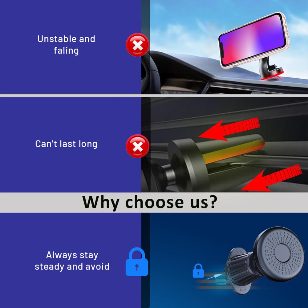 - جاذبية مغناطيسية فورية: تعمل المغناطيسات القوية على تثبيت هاتفك بسرعة وسهولة بمجرد تقريبه، مما يجعله ثابتًا تمامًا عند الانعطافات والمطبات والفرملة المفاجئة.